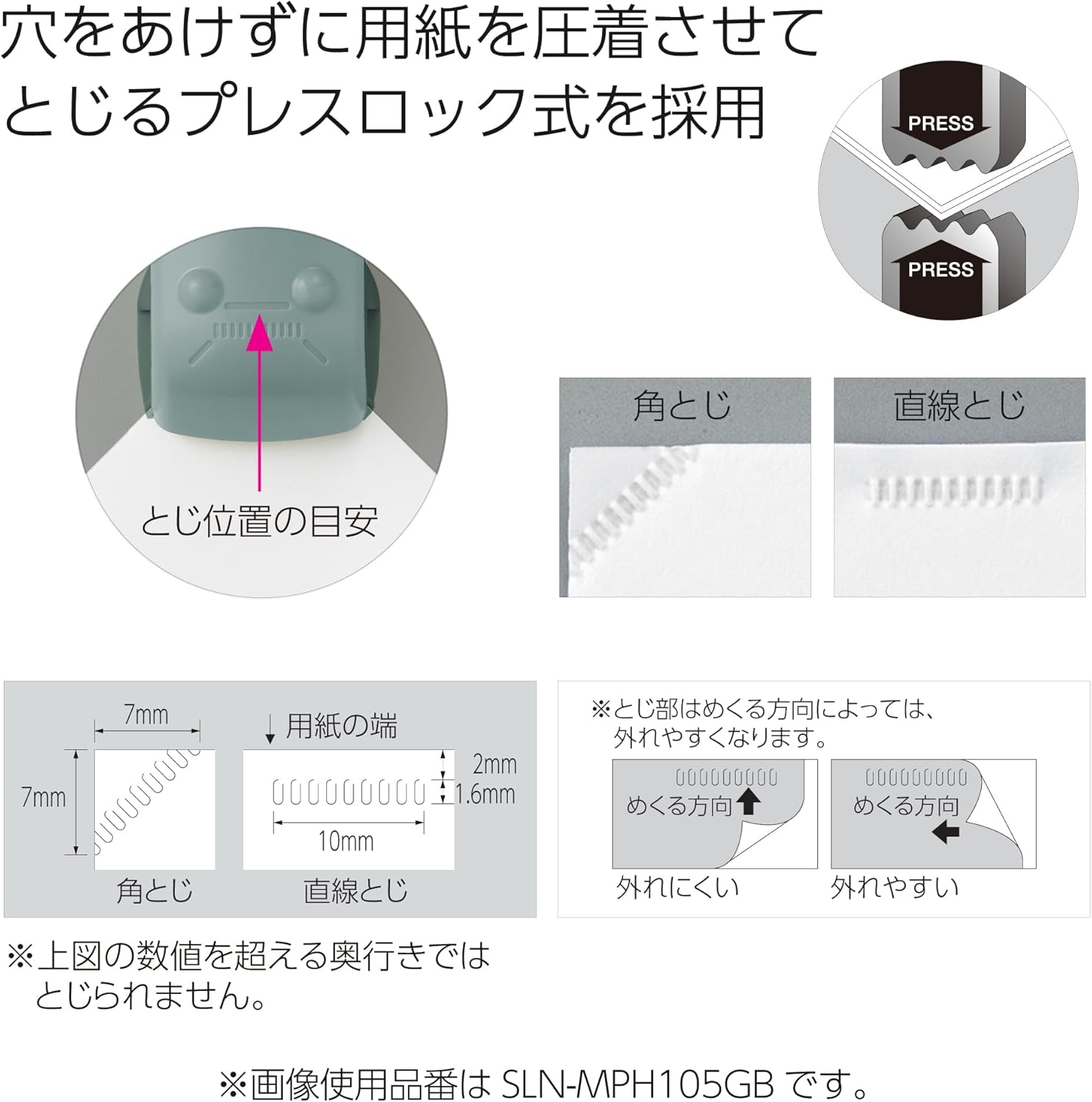 Press-type mechanism Creates a small cut and fold in the paper to lock sheets together securely.