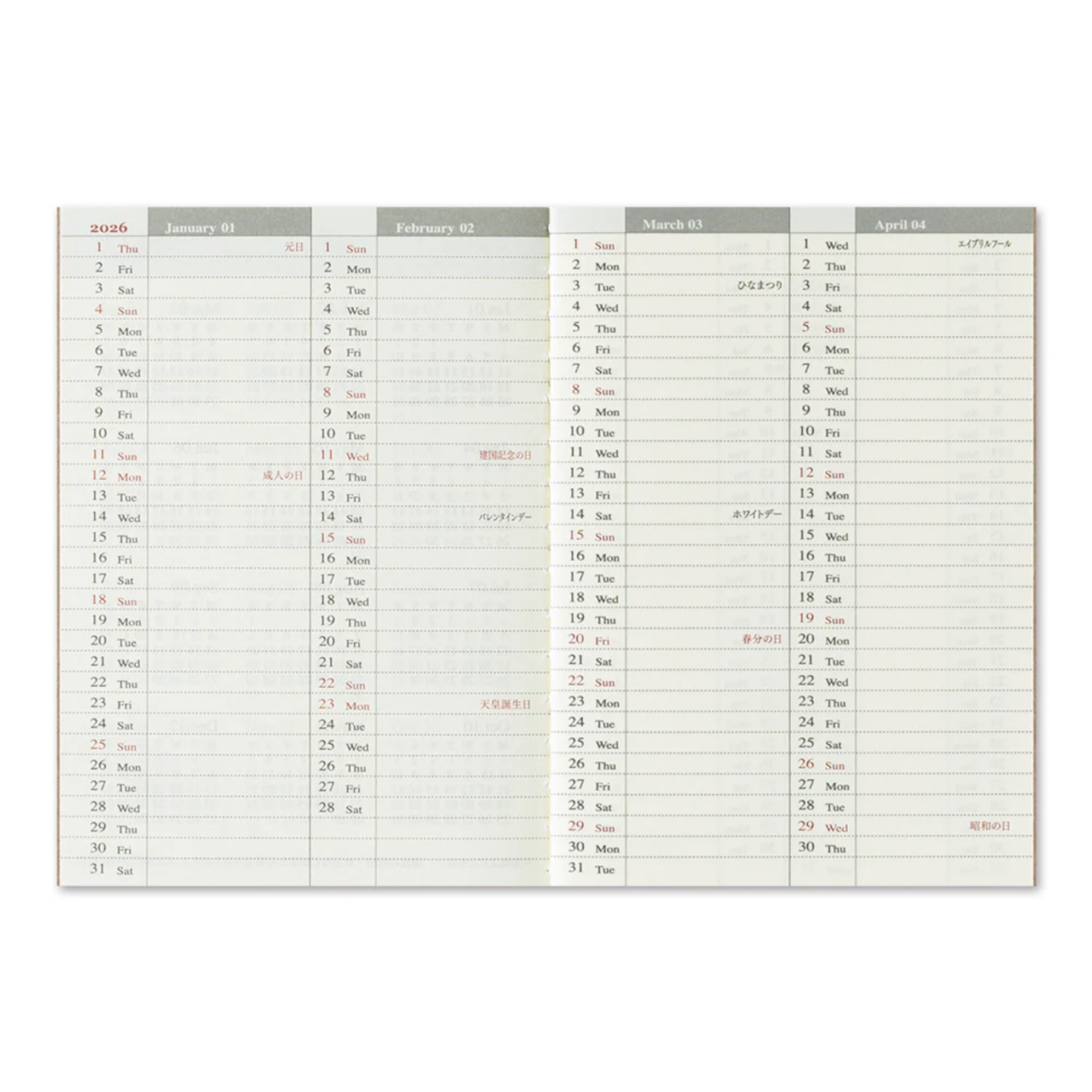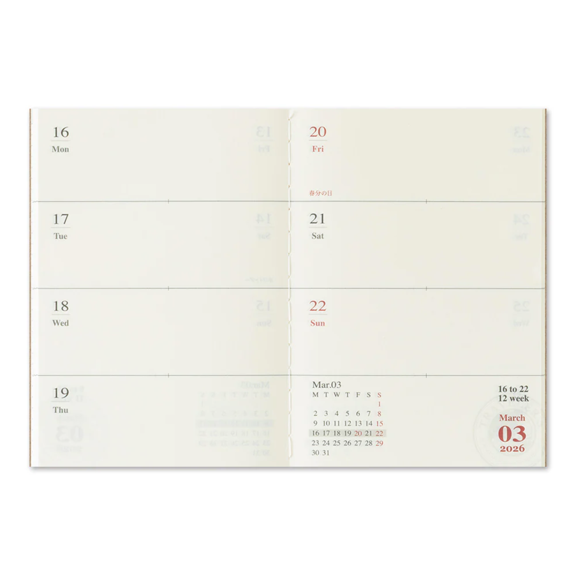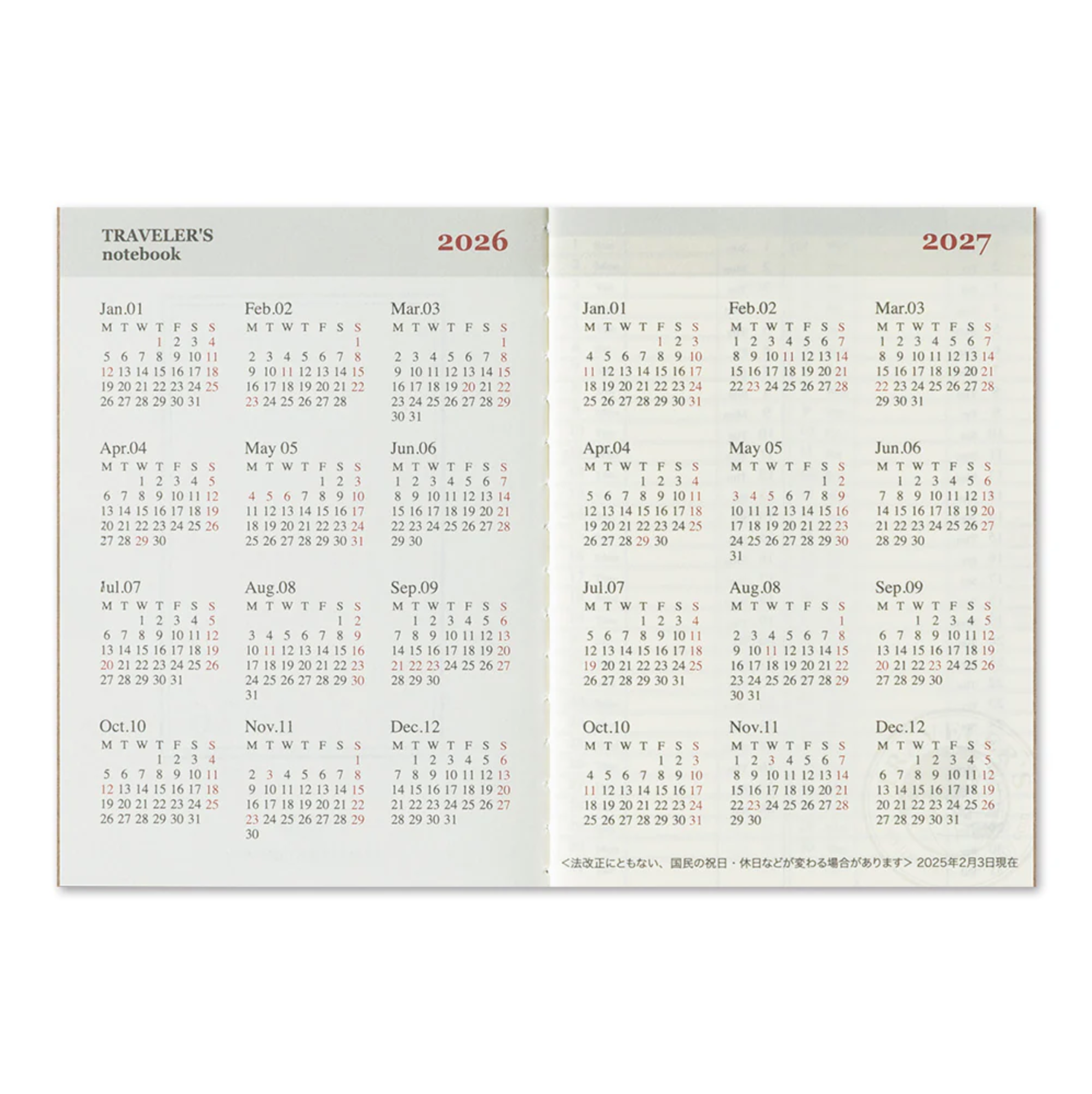 This is a 2026 weekly diary refill for the Traveler's Notebook Passport Size.