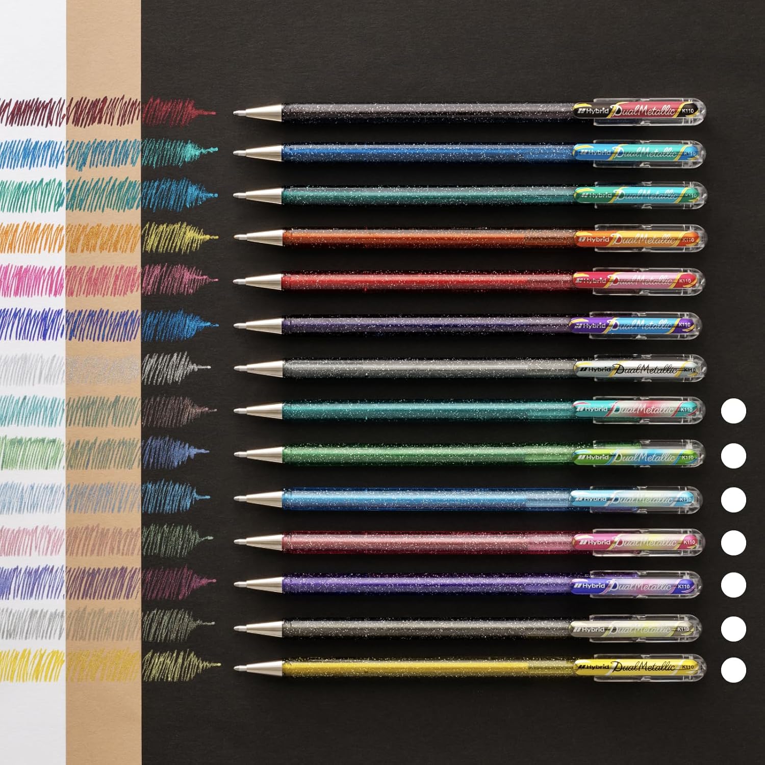 Unleash a shimmering metallic palette with this 7-pen gel set from Pentel — perfect for cards, journaling, scrapbooking, and creative projects. Each pen features Dual-Metallic ink that shifts tone depending on the paper and light, giving you dynamic, sparkling effects on both light and dark backgrounds.