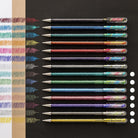 Dual-Metallic Gel Ink: Each pen blends two hues — base ink + metallic pigment — delivering a shifting shimmer that changes with light and paper tone.