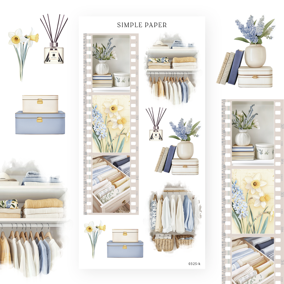 Add a touch of cozy charm and effortless organization to your journaling! Spring Refresh - Sheet K captures neatly arranged closets, soft linens, elegant storage boxes, and delicate florals- all framed in a nostalgic filmstrip style. A perfect way to bring both structure and beauty to your planner spreads.