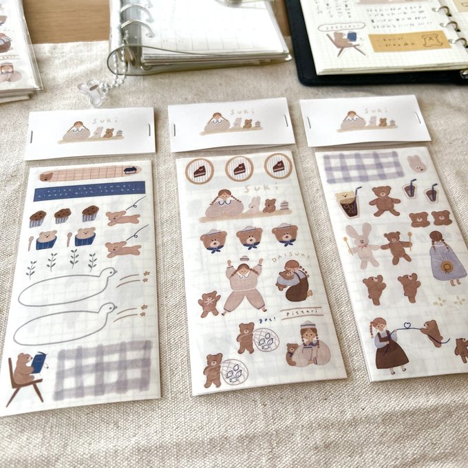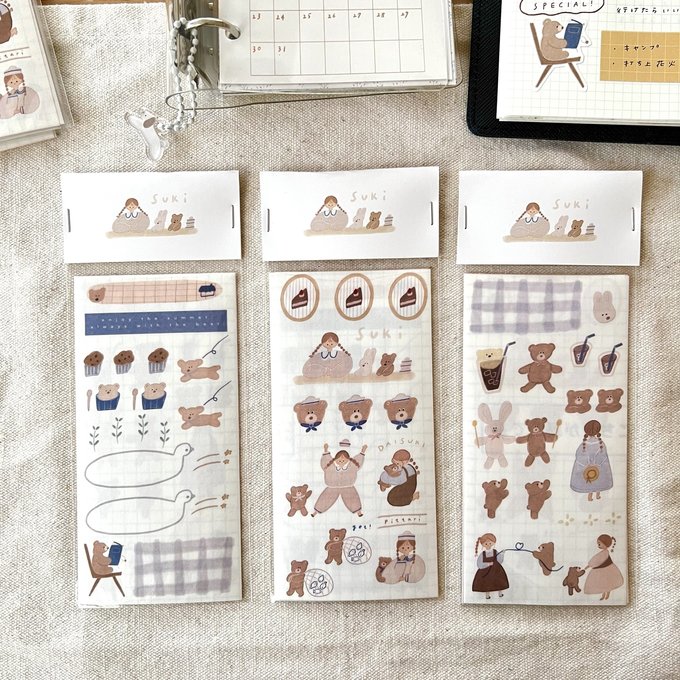 Set of 3 sticker sheets on Japanese washi paper. One design per sheet. Stickers are not kiss cut and must use scissors to cut them out.